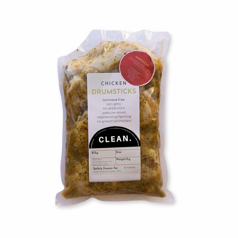 6 x chicken drumsticks in an exotic Africa-inspired marinade (extra virgin olive oil, organic preserved lemon, organic lemon juice, garlic, ginger, spices, herbs, Himalaya salt and pepper).